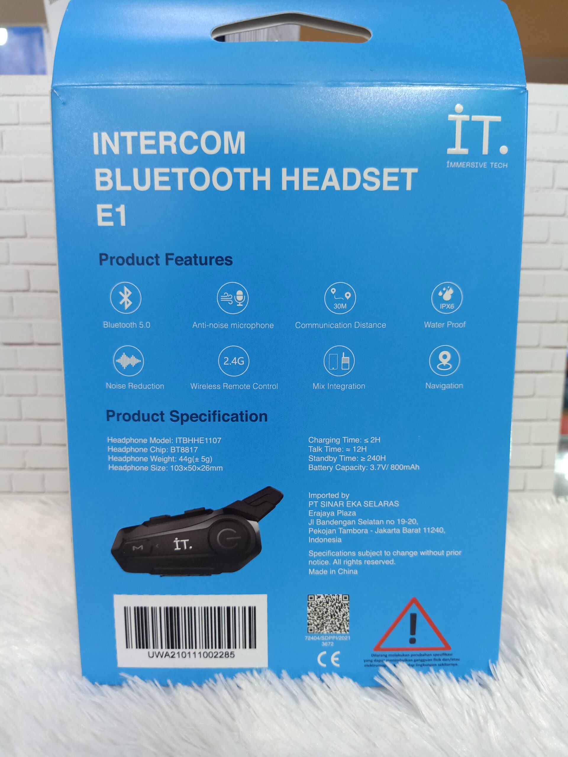 IT Intercom Bluetooth Headset E1 dilengkapi proteksi air pada level IPX6, sehingga aman dipakai dalam kondisi hujan deras sekalipun.