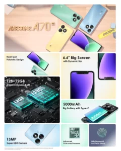 Spesifikasi Itel A70 Layar Layar IPS LCD 6,6 inci, resolusi HD Plus (720 x 1.612 piksel), refresh rate 60 Hz, brightness 500 nits, kerapatan piksel 267 ppi, touch sampling rate hingga 120 Hz Dimensi 164 mm x 75,6 mm x 8,6 mm, bobot 187 gram. Chipset Unisoc T603 (12 nm) RAM dan media penyimpanan RAM: 3 GB/4 GB (+ Extended RAM 8 GB) Storage: 128 GB Kamera depan 8 MP Kamera belakang Kamera utama: 13 MP Kamera depth: 0,3 MP Sistem operasi Android 13 Go Edition, dilapisi antarmuka Itel OS 13 Baterai 5.000 mAh Fitur pendukung Konektivitas 4G, sensor pemindai sidik jari (fingerprint) samping (side-mounted), face unlock, Wi-Fi, Bluetooth 5.0, USB-C, jack audio 3,5 mm, dual-SIM, radio FM, Power Marathon, Extended RAM, Dynamic Bar Warna Hitam, Biru