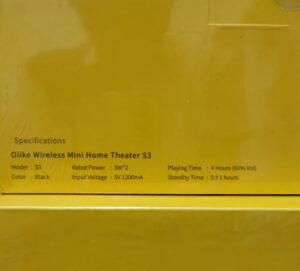 Olike Wireless Mini Home theater S3 By FreeGift Realme 10 Warna Hitam Rated power 3W*2 input Voltage 5V 1200mA Playing time 4 Hours (60% Vol) Standby Time 5 +- hours